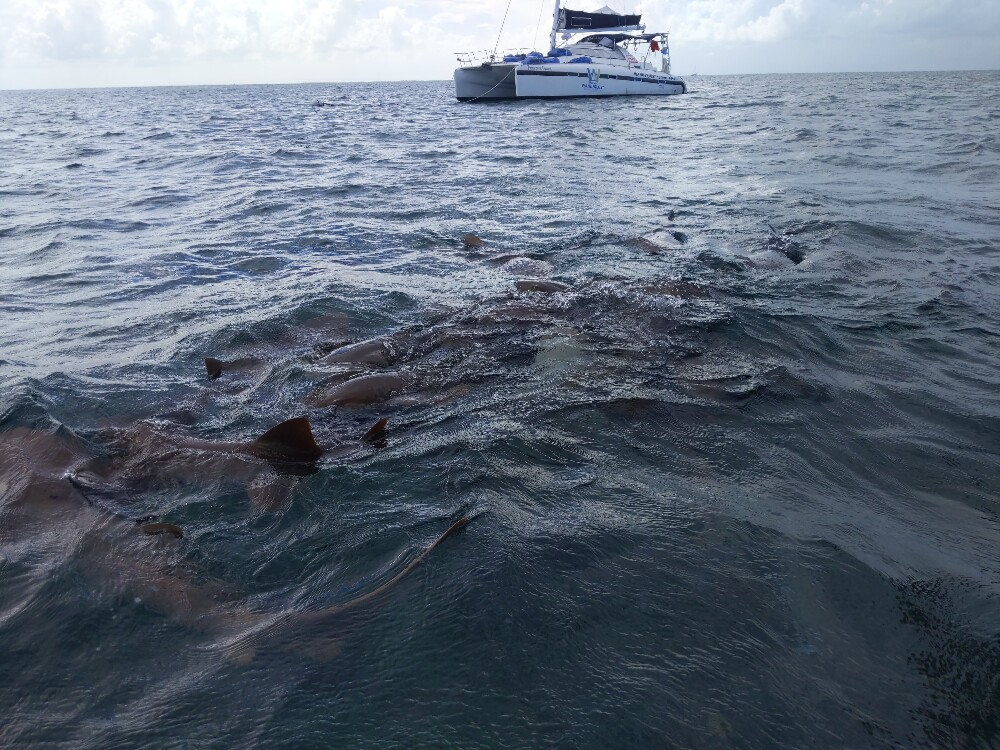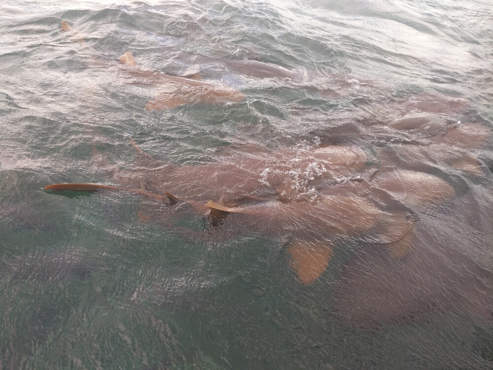 Un peu plus loin, nous nous arrêtons pour nager avec les requins. Nos guides leur offrent des poissons pour les attirer, quelques plus petits poissons se joignent au festin. Nous allons nager un peu avec eux mais ils sont tellement les uns sur les autres et agités que nous ne voulons pas trop les approcher. Mais ils ne sont pas du tout agressifs envers nous, ni même envers les autres poissons. Ils font leur vie en nous ignorant. Tout ce qu'ils veulent, ce sont les poissons déjà morts qu'on leur jette.