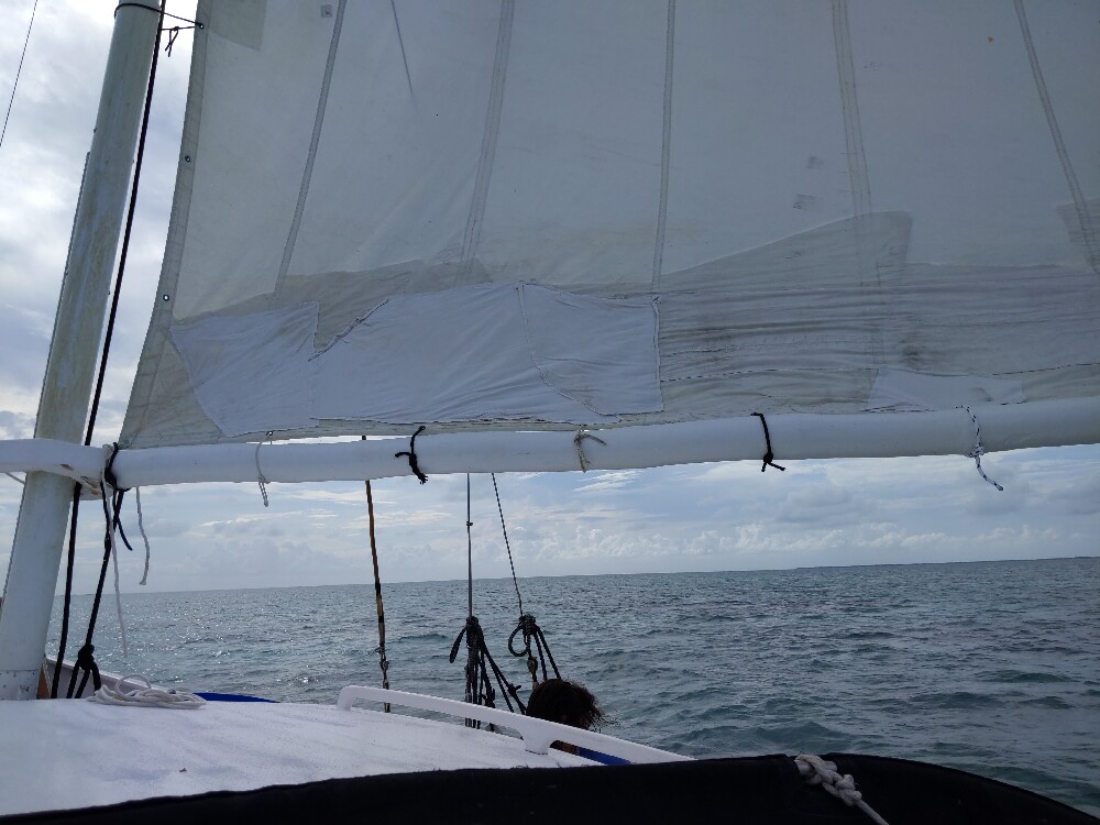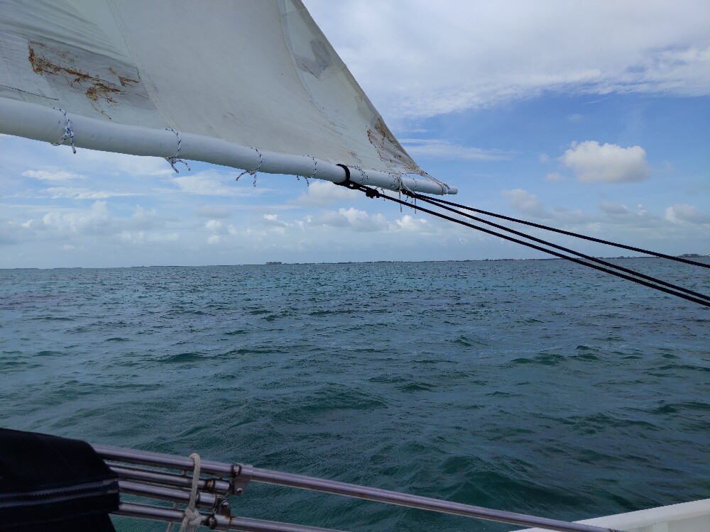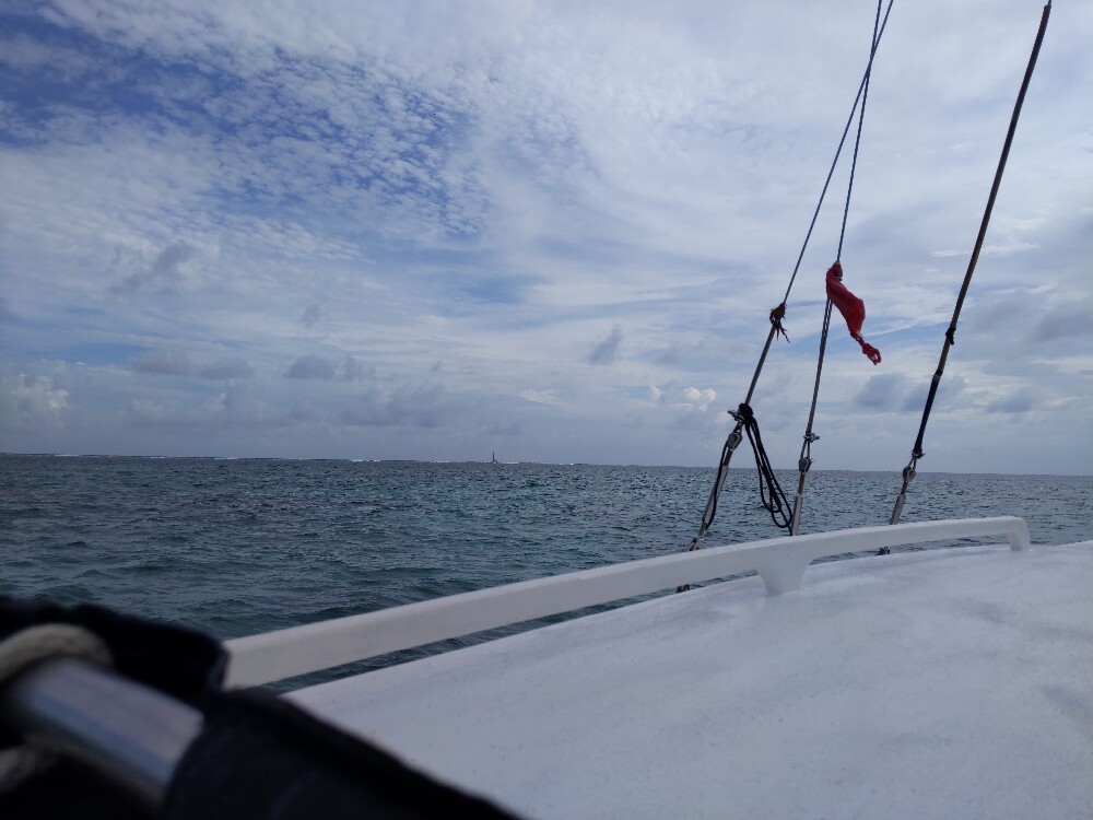 Après cette petite visite guidée du récif corallien, nous remontons à bord du bateau. Nos deux marins hissent les voiles, nous rentrerons par la force du vent.